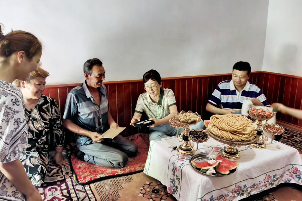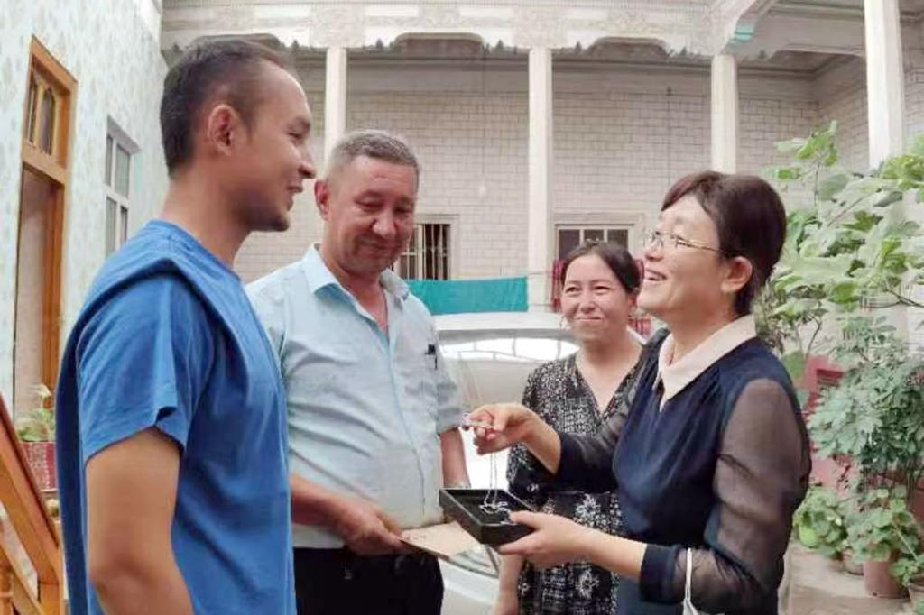 熊冬梅向苏热叶·艾河提江父母赠送纪念品